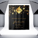 Um fundo preto chique. Decorado com estrelas douradas pingando e um top de touca dourado falso moderno e abstrato, com o ano dentro. Texto: Parabéns! O texto: Graduado, e o nome estão escritos com um estilo de letra manuscrita moderna e grande. Para ele e para ela. Uma faixa, decoração de festa ou cabine de fotos, fundo para uma festa de formatura de 2023 (ou qualquer ano).