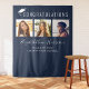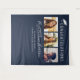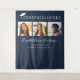 Tapeçaria de fundo para cabine de fotos de festa de formatura azul escuro elegante com "Parabéns" em tipografia branca grande e uma ilustração de um chapéu de formatura branco no topo, uma colagem de três fotos, o nome dela