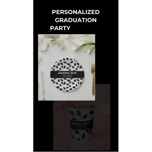 As cores da escola preto e branco, bonés de formatura pretos jogados no ar para ele e para ela. Belo pano de fundo de fotos de festa de formatura para um formando de um segundo grau, universidade ou universidade com cores de preto e branco na escola. Personalize com o nome, classe e nome da escola do aluno de graduação.