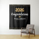 Tapeçaria elegante para festa de formatura com um fundo preto elegante que pode ser alterado para qualquer cor, o ano da turma "2025" em balões de hélio dourados, bordas com brilho dourado, o título "parabéns", o nome deles e a escola ou faculdade que frequentaram.