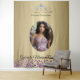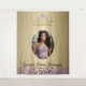 No topo deste pano de fundo impressionante está uma tiara cativante, adornada de ouro e joias ametistas. A intrincada design de tiara reflete a intrincada transição da infância para a infância, simbolizando a jornada da jovem para a maturidade e independência. Suas joias radiantes captam a luz, lançando delicadas reflexões que dançam ao fundo e adicionam uma camada extra de esplendor à cena. Como ponto focal, há uma foto enquadrada da própria quinceañera, capturando um momento congelado no tempo. A foto capta seu sorriso radiante, o brilho em seus olhos, e o entusiasmo que dela emana enquanto ela se posiciona na beira desse marco transformador. Seu vestido, provavelmente uma mistura harmoniosa de ouro e roxo, complementa as cores do pano de fundo, criando uma conexão perfeita entre ela e o cenário. No geral, o pano de fundo da Fiesta de Quinceañera é uma obra-prima visual, uma combinação artística de ouro gradiente e matizes roxas que estabeleceu o palco para uma celebração memorável. A tiara e a fotografia da quinceañera servem como lembretes pungentes do significado do evento e do espírito radiante da jovem no coração da celebração.
