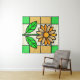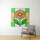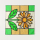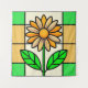 uma janela de vidro manchado ilustração de uma margarida amarela e branca com folhas verdes.