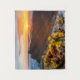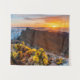 Esta incrível foto do Getty Images apresenta plantas floridas em rochas no pico do Pico de la Zarza sob o céu queimado ao amanhecer, Fuerteventura, Ilhas Canárias, Espanha