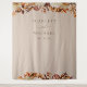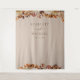 Esta elegante tapeçaria de casamento | fundo de cabine de fotos apresenta folhas de laranja queimada e terracota pintadas à mão em aquarela, dálias creme e bege, e belas rosas de cor enferrujada em um fundo taupe com os nomes dos noivos e a data do casamento. Encontre itens correspondentes na Coleção Taupe Autumn Romance.