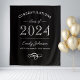 Um banner de fundo para fotos de festa de formatura personalizado 'Parabéns' elegante e moderno apresenta um design de tipografia estiloso e uma paleta de cores clássica em preto e branco. Personalize com o nome do formando e da escola. Nota: as cores do design podem ser personalizadas para combinar com outras cores da festa ou da escola.