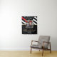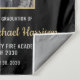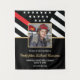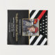 Este design apresenta uma bandeira de bombeiros com listras pretas e brancas, e uma fina faixa vermelha também. Um crachá de bombeiro está sentado acima de todos os detalhes da festa para o bombeiro graduado, que está próximo a uma fotografia do novo formando da academia de fogo.