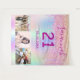 Para uma festa de 21º aniversário. Uma colagem de 3 fotos suas com amigos, familiares, interesses ou animais de estimação. Um fundo holográfico colorido em roxo, rosa, dourado rosado e verde menta. Decorado com pingentes de brilho falso. Personalize e adicione o nome dela, 21 anos e uma data. Data de nascimento ou data da festa de aniversário. Texto colorido em roxo. Perfeito para uma festa surpresa! Use como banner de boas-vindas, decoração de parede ou como fundo para cabine de fotos.