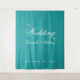 Um simples fundo de casamento para um casamento azul-turquesa (uma cor moderna). Em um fundo azul-turquesa, a palavra Casamento e os nomes são escritos em uma fonte caligráfica elegante, o resto em maiúsculas. Todo o texto é branco e pode ser personalizado.