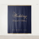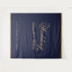 Um fundo de casamento para um casamento azul marinho e dourado. Em um fundo azul marinho, a palavra Casamento e os nomes são escritos em uma fonte caligráfica elegante, o resto em maiúsculas. Todo o texto é dourado e pode ser personalizado. As bordas superior e inferior são de falso ouro.