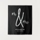 Fundo de casamento preto e branco "Sr. e Sra." com sobrenome e data personalizados. Decorações elegantes para recepção ou cerimônia.