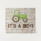 O pano de fundo do chá de bebê da fazenda apresenta um trator verde com um fundo de madeira rústica. Este pano de fundo para chá de bebê é facilmente personalizado para o seu evento adicionando texto.
