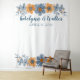 Esta tapeçaria de fundo de cabine de fotos de casamento impressa personalizada apresenta uma ilustração floral em estilo aquarela em tons mais suaves de azul e laranja, tornando-a perfeita para casamentos e eventos especiais de outono. Use os campos do modelo para personalizar facilmente este fundo com suas informações. Precisa incluir mais informações? Selecione a opção PERSONALIZAR para adicionar texto adicional a esses fundos.