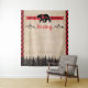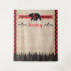 Fundo de cenário para festa de lenhador com ícones de urso, montanha e floresta, personalizado com as saudações, nome e idade do seu filho,