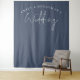 Fundo de Foto de Casamento Azul Navy Empoeirado com Rótulo. Ótimo fundo para fotos para você e seus convidados posarem e capturarem memórias divertidas em sua festa de casamento! Um conjunto elegante para Casamento e facilmente personalizável com seus nomes curvados acima.