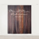 Placas de madeira escuras rústicas ao fundo, com tipografia elegante para nome da família de Sr. e Sra. personalizado; combinado com tipografia serifada para data personalizável. É um design atemporal feito especificamente para um casamento rústico ou celebração de aniversário.