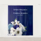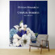 Elegante, romântico e belo detalhe floral em aquarela em azul em pó, cobalto e creme. Seria uma decoração linda para receber os convidados e também como fundo de parede para fotos.