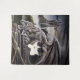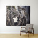 O gatinho de smoking preto e branco está sentado ao lado de um gárgula. Atrás deles está um castelo e dragões.