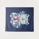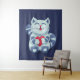 Gatinho com tapeçaria cardíaca com uma ilustração digital fofinha mostrando um gato azul feliz apaixonado. O pequeno felino está sorrindo e segurando um grande coração vermelho.