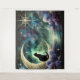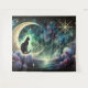 Este encantador design celestial apresenta um gato preto elegantemente empoleirado em uma ornamentada lua crescente dourada, cercado por estrelas cintilantes e nuvens cósmicas. Tons profundos de azul-teal, índigo e violeta criam uma atmosfera noturna sonhadora, enquanto detalhes dourados adicionam um toque de magia e elegância. A cena mistura mistério e serenidade, evocando um sentimento de admiração sob o céu estrelado.