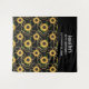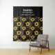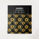 Tapeçaria de aniversário com um padrão elegante e sofisticado. Lindos girassóis amarelos e folhas verdes rodeados por delicadas correntes de ouro. Fundo preto.