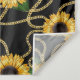 Tapeçaria de aniversário com um padrão elegante e sofisticado. Lindos girassóis amarelos e folhas verdes rodeados por correntes de ouro delicadas. Fundo preto.