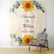 Um fundo dourado pintado à aguarela. Decorado com folhas de eucalipto pintadas à aguarela, raminhos, folhagens, girassóis e folhas de ouro falso. Personalize e adicione os nomes da noiva e do noivo, e a data. Pode ser usado como um banner de boas-vindas, como decoração de parede de festa ou como fundo de cabine de fotos.