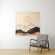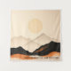 A serene minimalist landscape featuring layered mountain ranges under a large, soft-yellow sun. The composition uses a sophisticated earth-tone palette, transitioning from deep charcoal black and burnt orange in the foreground to hazy, translucent beige peaks in the distance. The clean lines and flat aesthetic evoke a sense of peace and modern simplicity, blending traditional Japanese "Sumi-e" influences with contemporary graphic design.