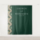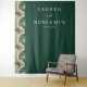 This elegant wedding backdrop features a sophisticated design with a rich green color palette and an intricate, wavy marble pattern along the side. The clean typography adds a touch of modernity to the classic aesthetic, creating a timeless and luxurious feel perfect for a special occasion. Ideal for setting a romantic and refined tone at your event, this backdrop is sure to complement any decor style while providing a beautiful focal point for photos.