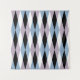 Um design de inspiração do século médio com um padrão de diamante de harlequin em azul, lilás poeirento, preto e branco.