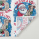 A fun, festive, and colorful cartoon illustration of Santa Claus happily holding a long, rolled-up "Naughty/Nice List." The background is a vibrant blue with white snowflakes and evergreen trees, enclosed by a circular border. Bold, red and white text prominently features the phrase: "HE'S ON A LIST AND IT'S NOT MINE." This design has a distinct, appealing retro or vintage feel, perfect for holiday apparel or greeting cards.