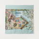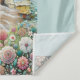Uma jovem com flores coloridas em seu cabelo está dormindo tranquilamente em frente a uma casa branca feita de várias sobras coloridas de papel. Árvores e flores florescentes rodeiam a cena, criando uma atmosfera sonhadora. Digital Art Photoshop CS5