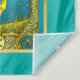 Tapeçaria em uma ilustração do cartão tarot, "O Sol", representando um sol radiante dominando o céu, seus raios de ouro ao redor de um garoto andando de cavalo branco. Ele simboliza inocência e vitalidade, enquanto o vivo fundo azul irradia alegria e clareza.