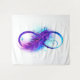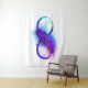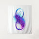 Símbolo infinito com uma bela pena pintada em cores roxas e azuis brilhantes sobre fundo branco.