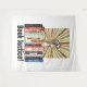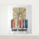 Protesto proibindo livros com esta imagem que apresenta uma prateleira de livros banidos, um protesto levantado, uma explosão de raios coloridos e as palavras "Justiça do Livro" em uma fonte retrô. Acentuado por uma borda de azul rico. Parece excelente!