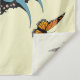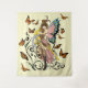 Uma fada loira Steampunk com asas rosa e azuis. A fada está vestindo roupas bonitinhas com chapéu de cima, corset e estrias, Borboletas, relógio, engrenagens e design tribal num fundo amarelo-claro