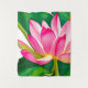 Tapeçaria em uma grande imagem de um lírio-d'água, em tons de rosa-coral pastel a médio, com folhas verdes esmeraldas
