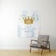 A little prince is on the way! Boy baby shower with gold crown and silver and gold stars with dreamy blue watercolor background