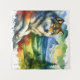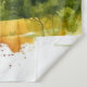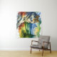 Esta é uma tapeçaria com um lobo de aquarela numa rocha na natureza.