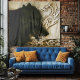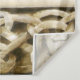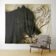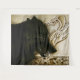Um perfil de um lobo negro solitário movendo-se sobre uma parede colorida de creme de pedra que tem o nó celta e o dragão celta esculpidos na parede.