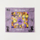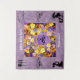 Um conjunto de flores multicoloridas em exibição atrás de uma lavanda e um quadro oval amarelo que diz 'Love Blooms..Forever. Dois pequenos pássaros pretos e brancos no centro com corações subindo. O texto é personalizável.