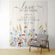This sweet and simple bridal shower backdrop is perfect for any nature loving bride-to-be. The design features the title "love in bloom" in a charming script and serif font and the bottom of the signage is adorned with a beautiful field of hand painted watercolor wildflowers, adding a touch of color and whimsy. The template wording is fully customizable so you can easily add your own details, making it a truly unique keepsake for the special day and is sure to impress your guests and set the tone for a beautiful and memorable bridal shower.