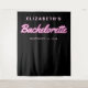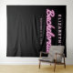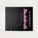 Tapeçaria elegante para cabine de fotos de despedida de solteira com "Despedida de Solteira" escrito em uma fonte rosa quente com efeito de luzes de neon em um fundo preto. Você pode personalizar com o nome dela e a data da festa. Uma área em branco na parte inferior fornece espaço para os convidados tirarem fotos contra o fundo.