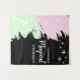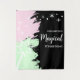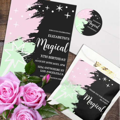 Magical kids birthday with stars and bubbles coming from a star shaped wand against a light pink and mint green background.