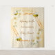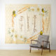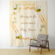 Elegante, divertido, tapeçaria de chá de fraldas de verão. Fundo amarelo, branco com um padrão de mel. Com uma falsa estrutura geométrica dourada. Decorados com flores tropicais, cor de creme, amarelo-claro, hibisco e abelhas-tronco felizes. Com o texto: Mamãe para Abelha e o nome da futura mãe. Modelo para o nome e uma data. Pode ser usado como decor de parede para o chá de fraldas ou como pano de fundo de fotos.
