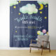 Este lindo tapete para chá de bebê ou fundo para cabine de fotos, neutro e azul-marinho, apresenta a frase "Cai, cai, estrelinha, você sabe como estamos ANIMADOS?" em uma fonte de letra manual moderna com estrelas douradas, nuvens cor-de-rosa, uma lua e uma raposa da floresta com balões. É perfeito para o chá de bebê do casal, seja para menina ou menino, e é fácil de personalizar com o nome do seu bebê.