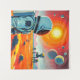 Um astronauta solitário está sobre uma paisagem de alienígena rochosa, mirando em uma enorme estrutura robótica com uma cúpula clara e pernas mecânicas. Vários planetas são visíveis no céu, criando uma cena marcante de exploração espacial.
