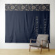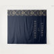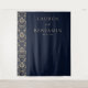 This is a classic style image featuring an elegant navy blue background with a sophisticated gold floral pattern on the left side. The names "Lauren and Benjamin" are written in an elegant, serif font, followed by their wedding date, "May 23, 2026," creating a timeless and refined look. The combination of deep navy and luxurious gold evokes a sense of grandeur and celebration, making it perfect for formal occasions like weddings or anniversaries. It inspires feelings of joy and anticipation.