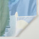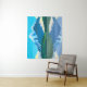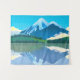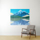 Tapeçaria em uma pintura digital de montanhas cobertas de neve e floresta de pinheiros, refletidas em um lago, sob um céu azul profundo