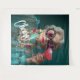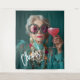 A imagem mostra uma na moda idosa adornada em joias ousadas e de tamanho excessivo, incluindo grandes pérolas e pedras vibrantes. Ela está vestindo óculos escuros redondos grandes embelezados com rochas, e seu batom vermelho brilhante complementa seu olhar glamouroso. Sua roupa chique é um conjunto de rendas turquesa, e ela segura um coquetel cor-de-rosa em um vidro delicado, exuando elegância e carisma.