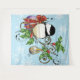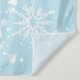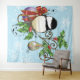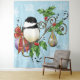 Galinha Bonita sentada em um galho de árvore no inverno com flocos de neve caindo por toda parte. Os enfeites de natal estão pendurados no galho da árvore em que está sentada a galinha.